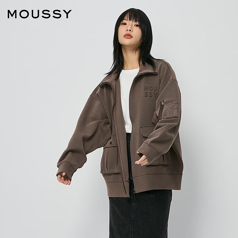moussy 秋季新品男友风贴布刺绣拉链外衣外套女028IAZ90-1017 060棕色 均码 00020/F